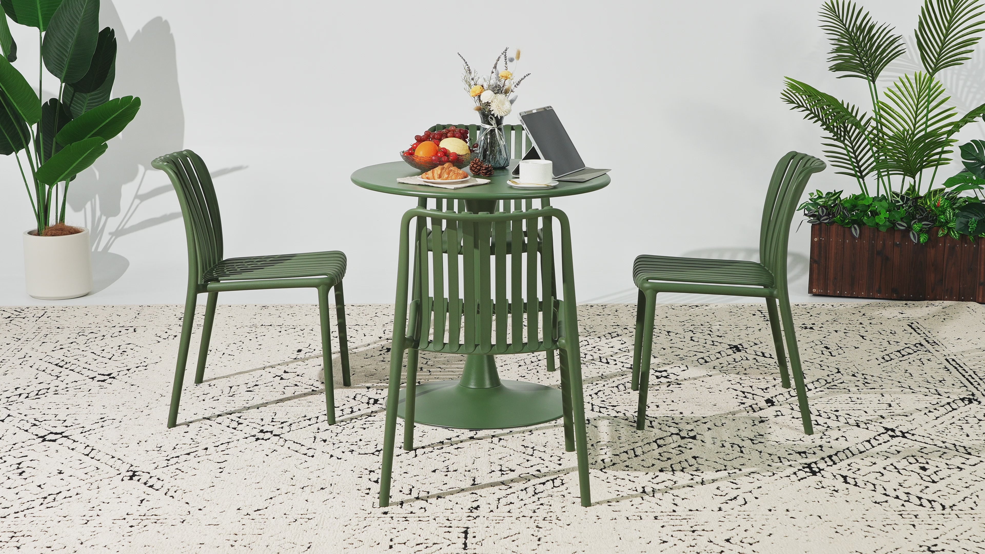 Elevate your outdoor gatherings with this four person dining table set. The round dining table, crafted from durable metal material with a rust-resistant e-coating and has a wide flat base to help prevent wobbling on slightly uneven floors, the charming design offers a modern foundation for al fresco dining. Complementing the table are four stackable patio chairs, designed for space-conscious living. Made from UV-resistant polypropylene resin, these lightweight chairs allow for effortless rearrangement, adapting to your evolving patio aesthetic. The sleek slat design ensures both comfort and practicality, promoting airflow and preventing water accumulation. Enjoy instant gratification with the fully assembled chairs, while the table's simple assembly for quick setup, making it the perfect centerpiece for your outdoor retreat ensuring this 4 person patio table and chair set is the perfect set for your patio this season.