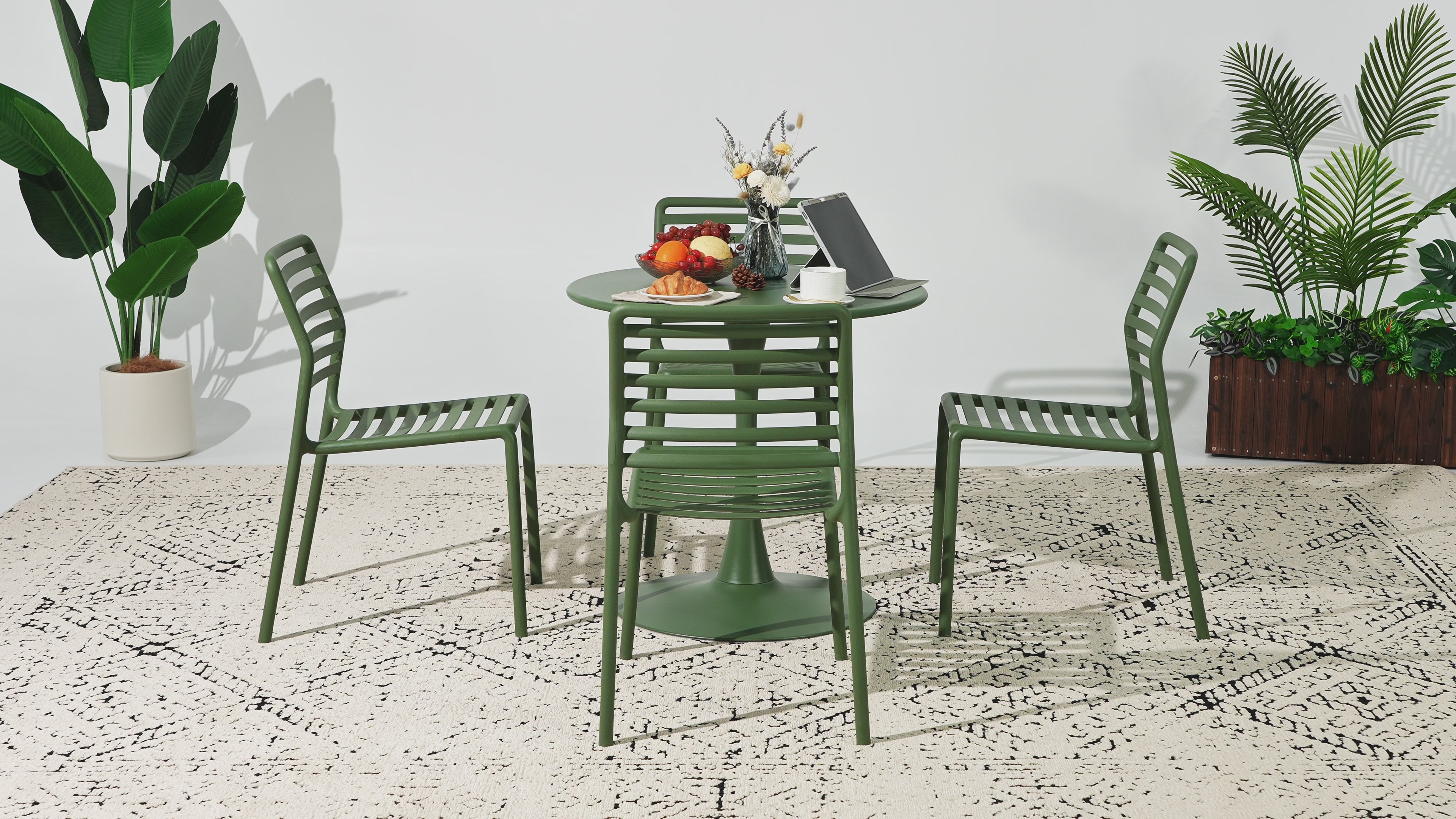 - Set Includes: One (1) 31.5" Metal Patio Dining Table & Four (4) Stackable Patio Dining Chairs