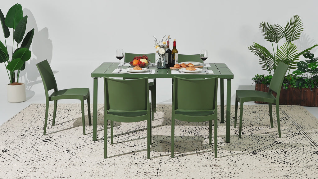 Elevate your outdoor gatherings with this six-person dining set. The rectangular table, crafted from durable iron with a rust-resistant e-coating, offers a modern foundation for al fresco dining. Complementing the table are six stackable patio chairs, designed for space-conscious living. Made from UV-resistant polypropylene resin, these lightweight chairs allow for effortless rearrangement, adapting to your evolving patio aesthetic. The sleek chair design ensures comfort with the open back promoting airflow to keep you cool and the splayed legs adds extra stability while the contoured seat and back offer optimal comfort on your pressure points. Enjoy instant gratification with the fully assembled chairs, while the table's simple leg attachment allows for quick setup, making it the perfect centerpiece for your outdoor retreat ensuring this 7-piece rectangle patio dining table set for 6 is the perfect set for your patio this season.