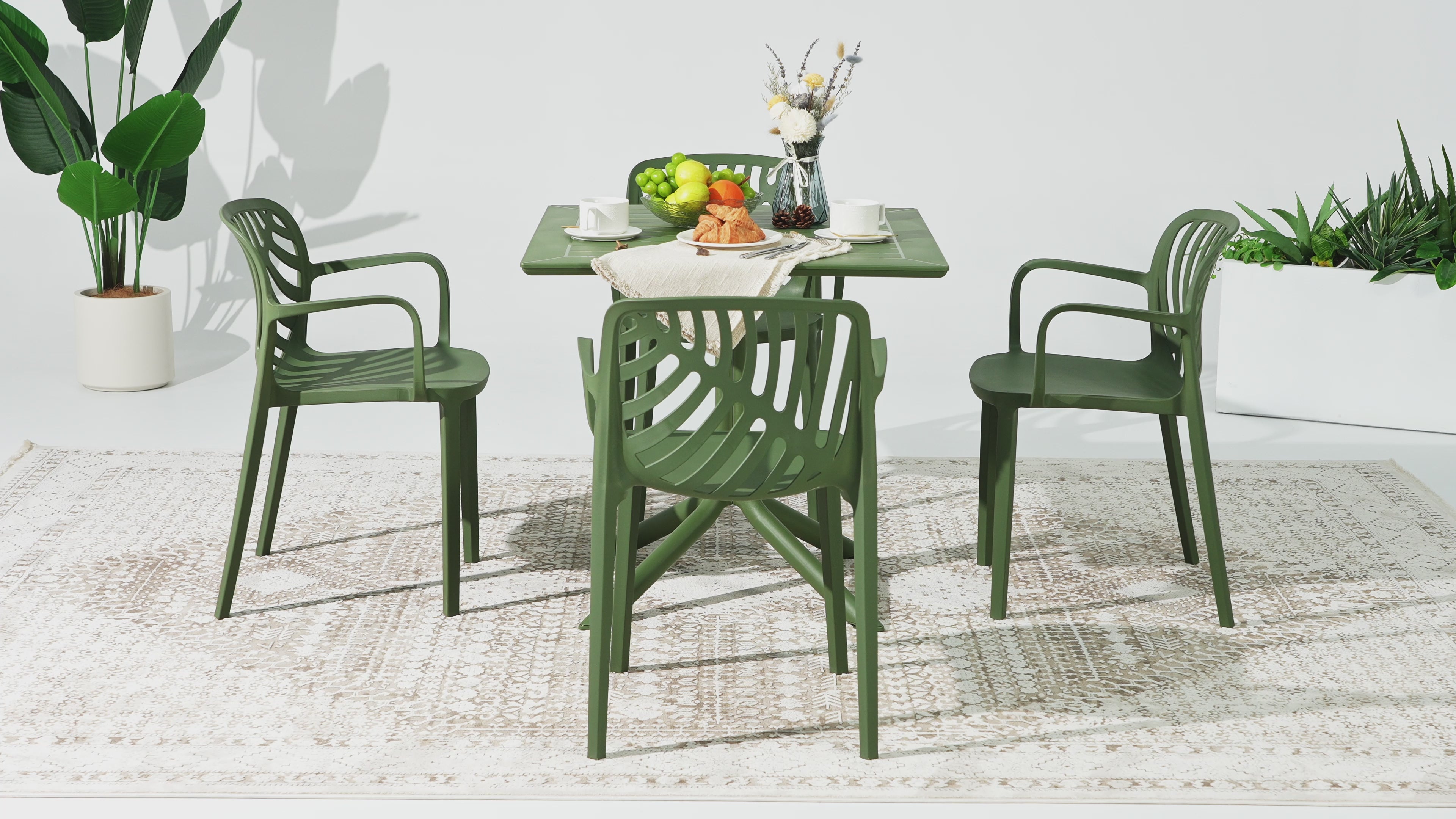 - Set Includes: Four (4) Plastic Resin Dining Chairs and One (1) 31.5" Wide Square Patio Dining Table