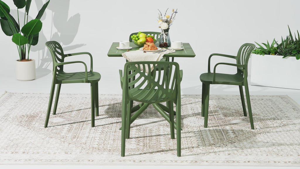 Gather with friends or family for a quick brunch on your balcony with our outdoor 5-piece outdoor square dining table set with 4 stackable resin patio dining chairs. Crafted from durable, all-weather Polypropylene (PP) resin plastic, prepared to withstand the elements while retaining their vibrant color year-round thanks to their UV and fade-resistant properties. Lightweight and simple to move, they are perfect for creating a flexible dining area on even the smallest balconies or patios. Designed with comfort in mind, featuring a charming palm leaf designed backrest to keep you cool on warm summer evenings by allowing fresh air through the back and equipped with rubber foot pads to protect your floors and the chair, the patio table is equipped with adjustable foot levelers to help prevent wobbling. And when not in use, the patio dining chairs stack neatly on each other for easy storage making this the perfect outdoor patio dining set for 4.