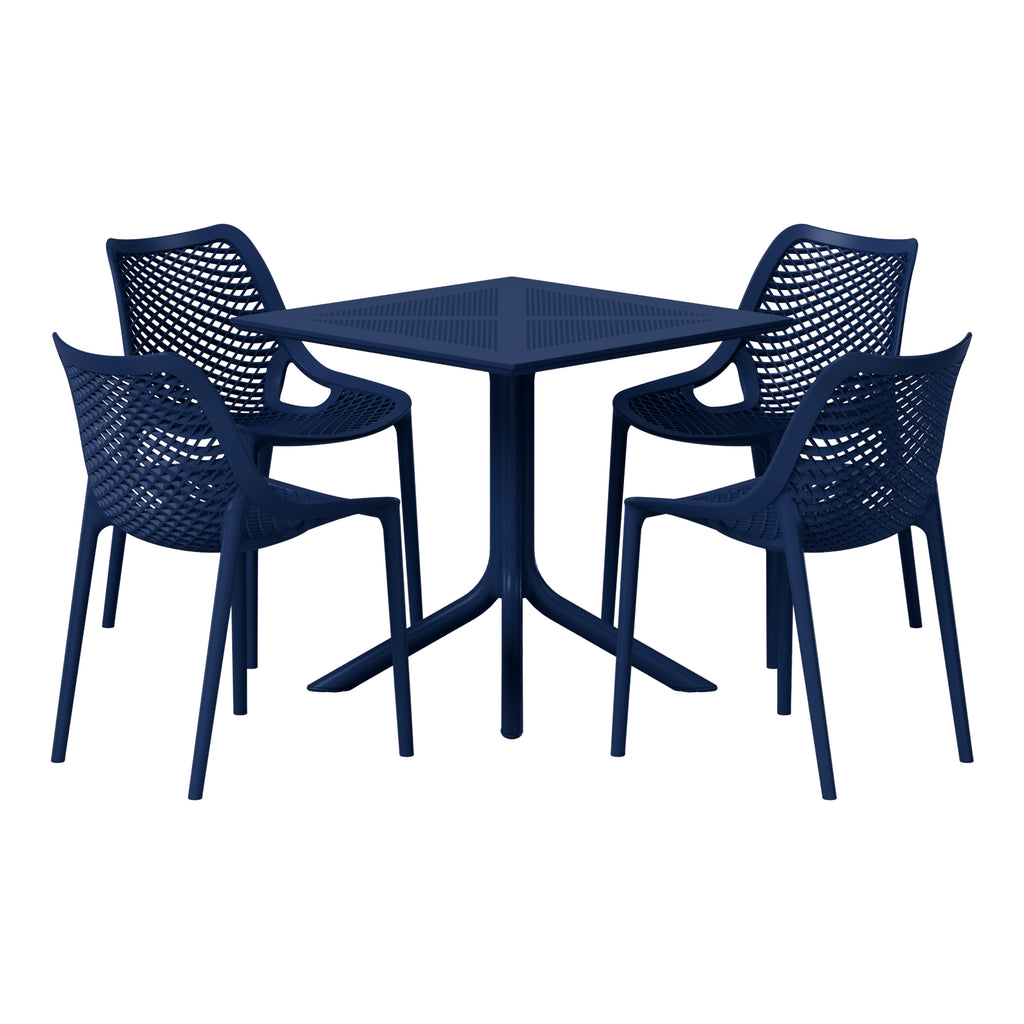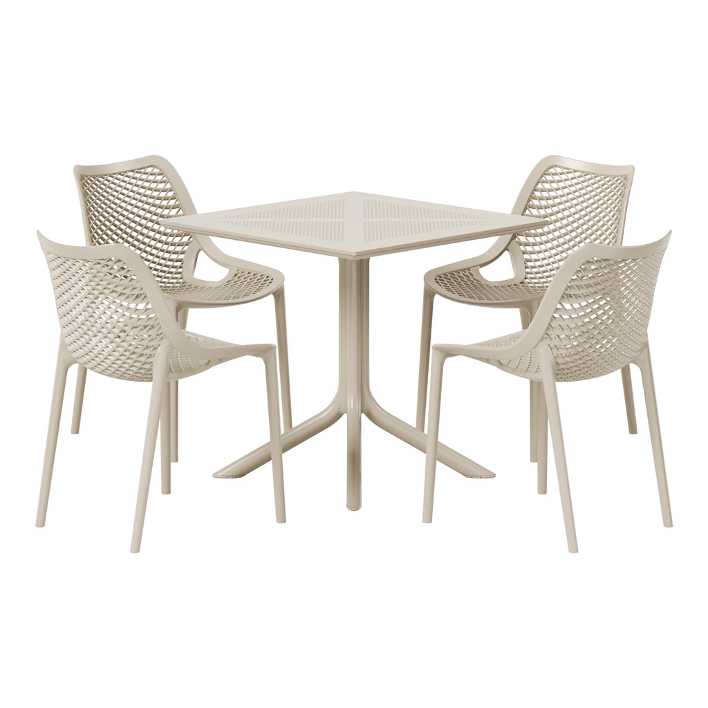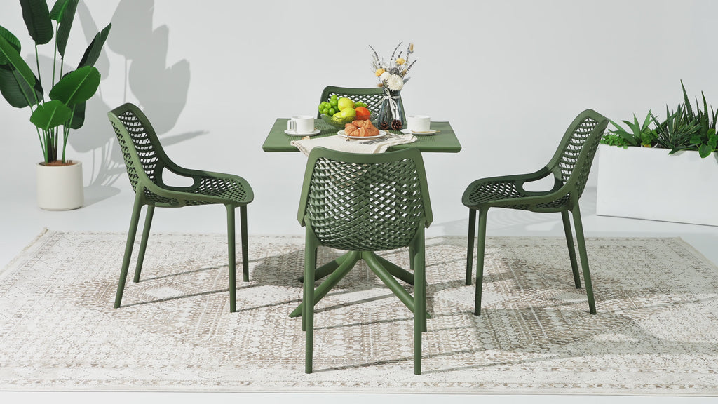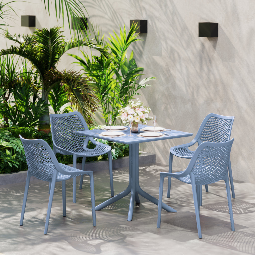 Gather with friends or family for a quick brunch on your balcony with our outdoor 5-piece dining table set with stackable resin dining chairs. Crafted from durable, all-weather PP resin, prepared to withstand the elements while retaining their vibrant color year-round thanks to their UV and fade-resistant properties. Lightweight and simple to move, they are perfect for creating a flexible dining area on even the smallest balconies or patios. Designed with comfort in mind, featuring a mesh design to keep you cool on warm summer evenings and adjustable foot levelers on the patio table to help prevent wobbling. And when not in use, the patio dining chairs stack neatly for easy storage and have a mesh design to help prevent water from puddling and improves airflow keeping you cool during those warmer days.