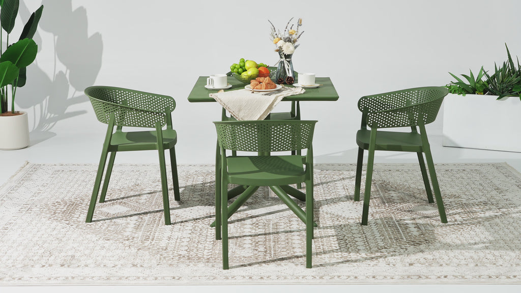 Gather with friends or family for a quick brunch on your balcony with our outdoor 5-piece dining table set with stackable resin dining chairs. Crafted from durable, all-weather PP resin, prepared to withstand the elements while retaining their vibrant color year-round thanks to their UV and fade-resistant properties. Lightweight and simple to move, they are perfect for creating a flexible dining area on even the smallest balconies or patios. Designed with comfort in mind, featuring a mesh backrest to keep you cool on warm summer evenings and adjustable foot levelers on the patio table to help prevent wobbling with a ventilated tabletop to help speed the drying process and prevent water from puddling on the table. And when not in use, the patio dining chairs stack neatly for easy storage for those with smaller spaces.