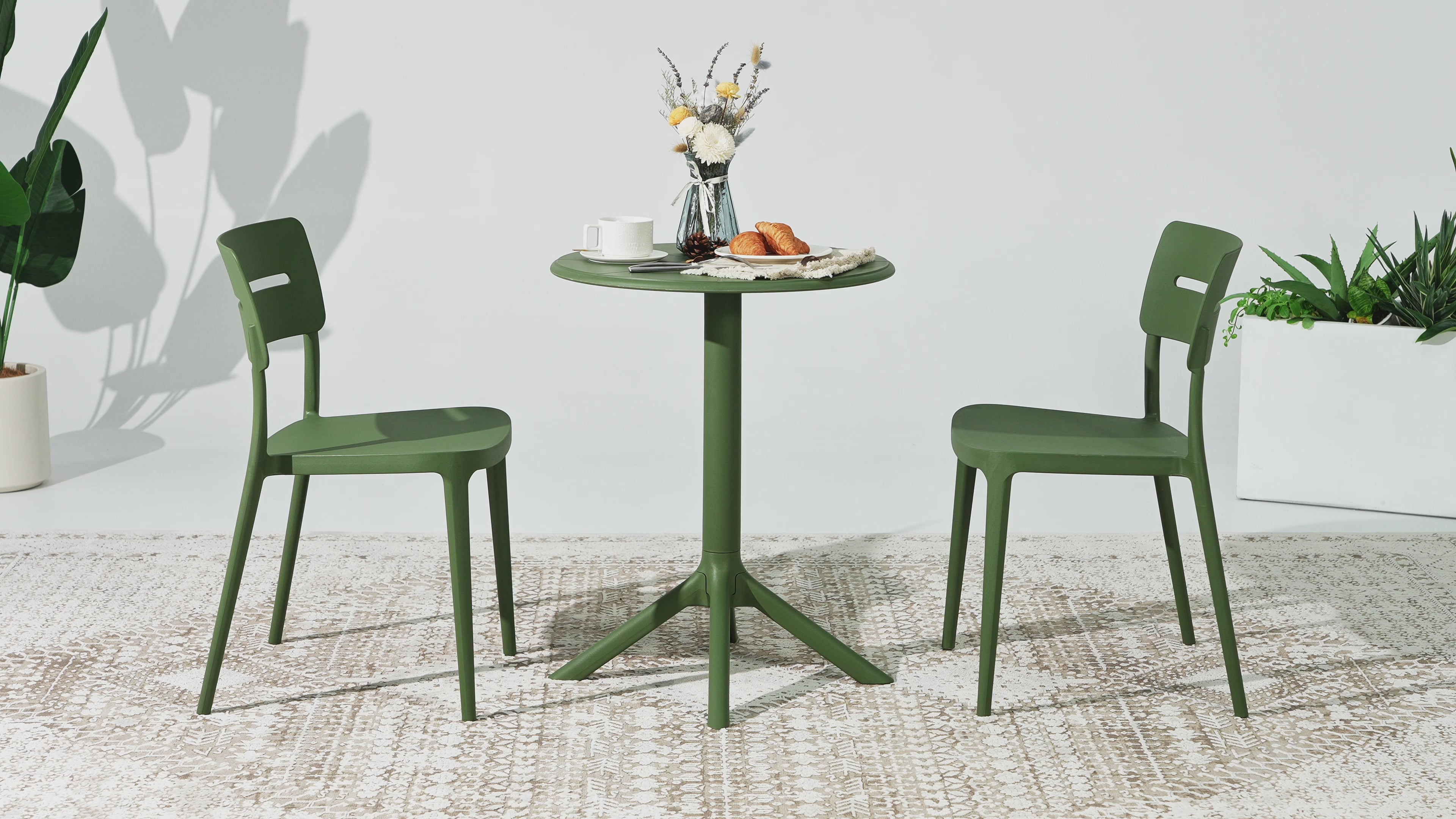 Gather with friends or family for a quick brunch on your balcony with our outdoor 3-piece outdoor patio bistro set with stackable resin dining chairs. Crafted from durable, all-weather Polypropylene (PP) resin, prepared to withstand the elements while retaining their vibrant color year-round thanks to their UV and fade-resistant properties. Lightweight and simple to move, they are perfect for creating a flexible dining area on even the smallest balconies or patios. Designed with comfort in mind, featuring a open backrest to keep you cool on warm summer evenings, adjustable foot levelers on the patio table help prevent wobbling and a iron block inside the pedestal base help keep the table stable during mild winds and the splayed legs add onto the existing stability. When the chairs are not in use, the patio dining side chairs stack neatly for easy storage and also have splayed legs to help with stability along with attachable foot pads to help prevent damage to your floor or chair.