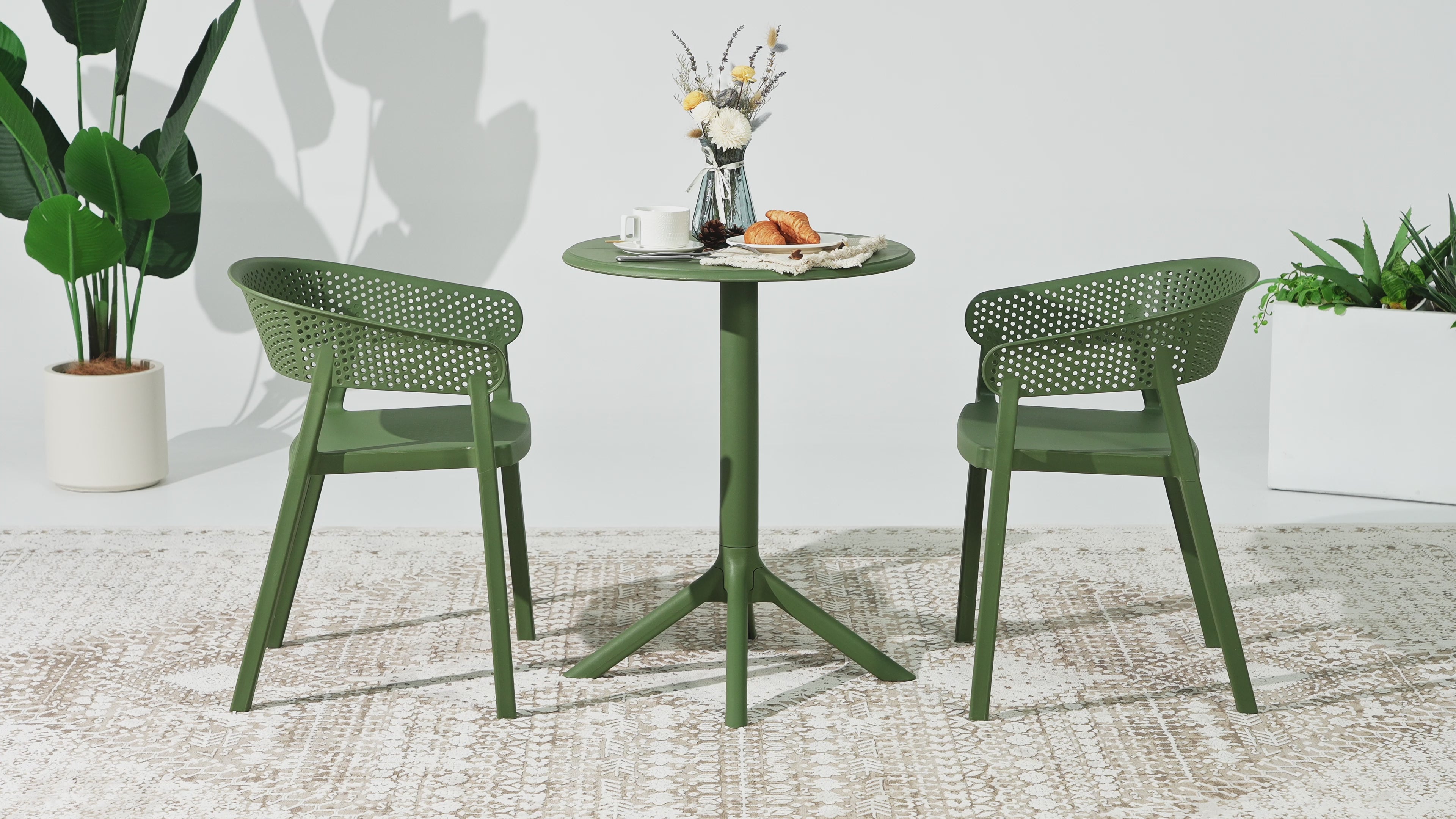 Gather with friends or family for a quick brunch on your balcony with our outdoor 3-piece outdoor patio bistro set with stackable resin dining chairs. Crafted from durable, all-weather Polypropylene (PP) resin, prepared to withstand the elements while retaining its vibrant color year-round thanks to its UV and fade-resistant properties. Lightweight and simple to move, they are perfect for creating a flexible dining area on even the smallest balconies or patios. Designed with comfort in mind, featuring a perforated backrest to keep you cool on warm summer evenings, adjustable foot levelers on the patio table help prevent wobbling and an iron block inside the pedestal base helps keep the table stable during mild winds and the splayed legs add onto the existing stability. When the chairs are not in use, the patio dining side chairs stack neatly for easy storage and also have splayed legs to help with stability along with attachable foot pads to help prevent damage to your floor or chair.