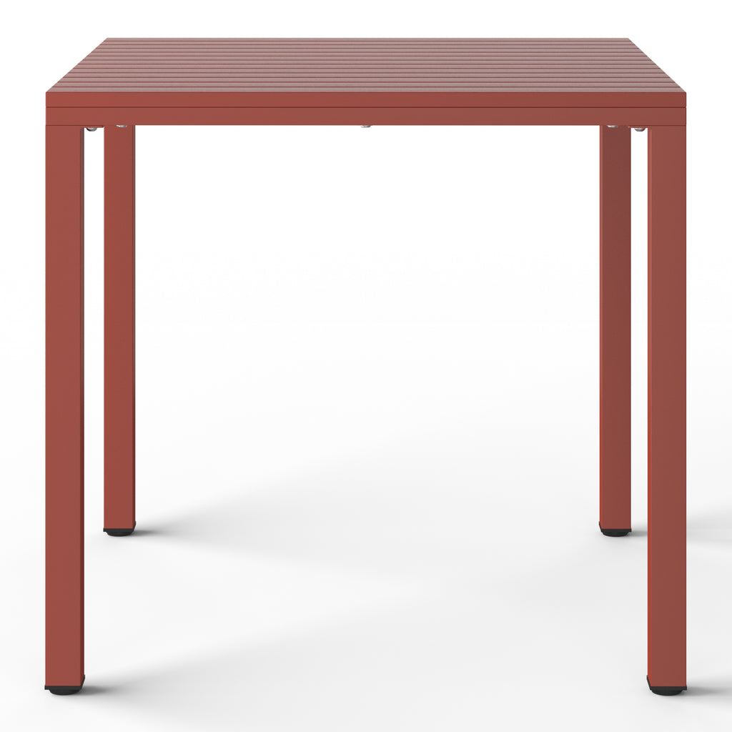 Elevate your patio with this contemporary 5-piece dining set, designed for both form and function. The 31.5" square table, featuring a sleek, scratch-resistant polystyrene top that has a wood-like pattern, is grounded by a modern iron frame with a durable, rust-resistant e-coating to ensure added protection against the outdoors. Adjustable leveling feet ensure stability on any surface, while the slatted tabletop offers practical drainage. Complementing the table are four stackable chairs, crafted from UV and fade-resistant polypropylene resin. Their open-back design promotes airflow, keeping you comfortable on warm days, and rubber foot pads protect your floors while adding stability. The clean lines and vibrant hues of this set bring a touch of modern sophistication to your outdoor space, creating an inviting setting for al fresco gatherings.