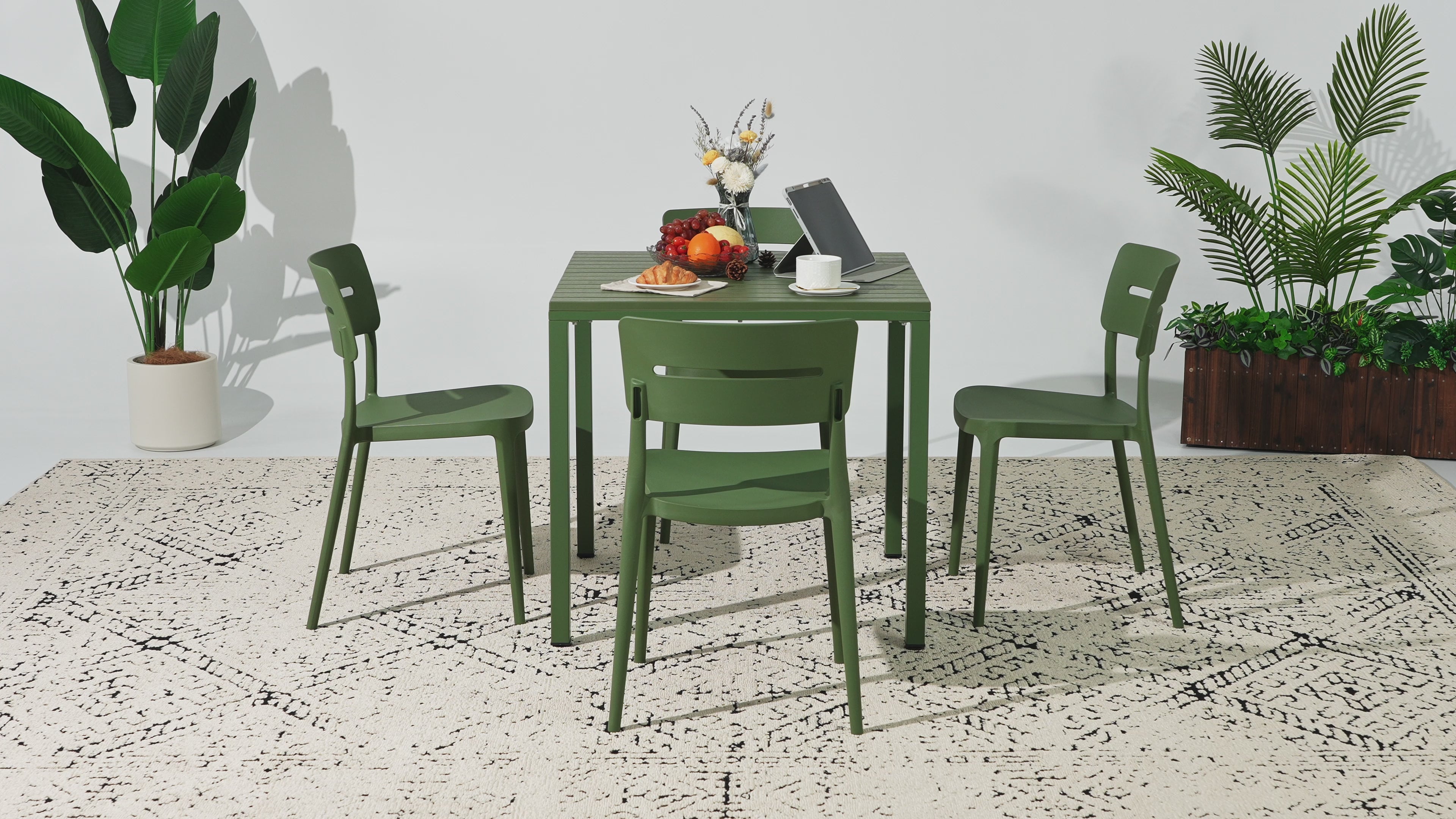 - Set Includes: Four (4) Plastic Resin Dining Side Chairs and One (1) 31.5" Wide Square Patio Dining Table