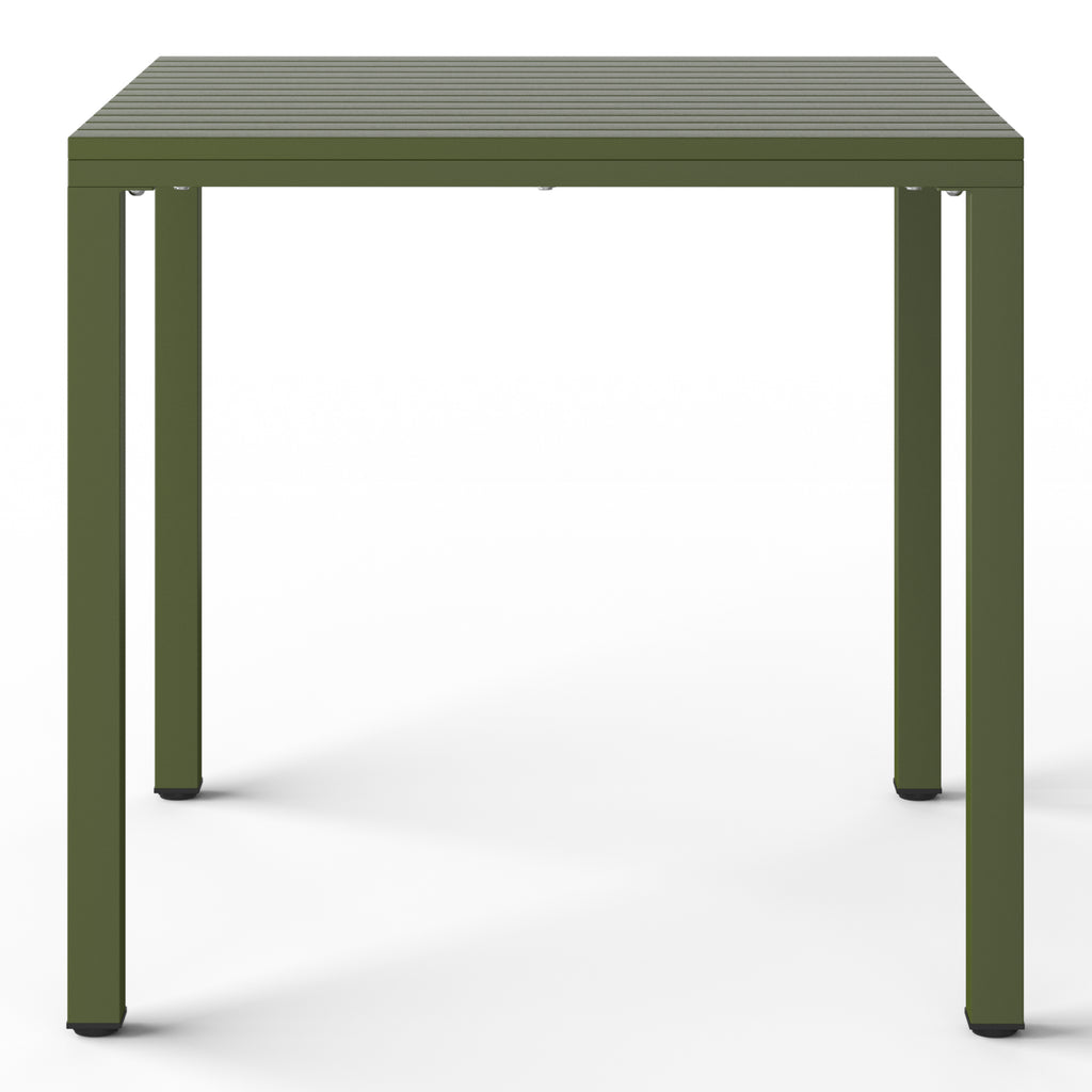Elevate your patio with this contemporary 5-piece dining set, designed for both form and function. The 31.5" square table, featuring a sleek, scratch-resistant polystyrene top that has a wood-like pattern, is grounded by a modern iron frame with a durable, rust-resistant e-coating to ensure added protection against the outdoors. Adjustable leveling feet ensure stability on any surface, while the slatted tabletop offers practical drainage. Complementing the table are four stackable chairs, crafted from UV and fade-resistant polypropylene resin. Their perforated back design promotes airflow, keeping you comfortable on warm days, and rubber foot pads protect your floors while adding stability. The clean lines and vibrant hues of this set bring a touch of modern sophistication to your outdoor space, creating an inviting setting for al fresco gatherings making this the perfect square patio table set for the summer.