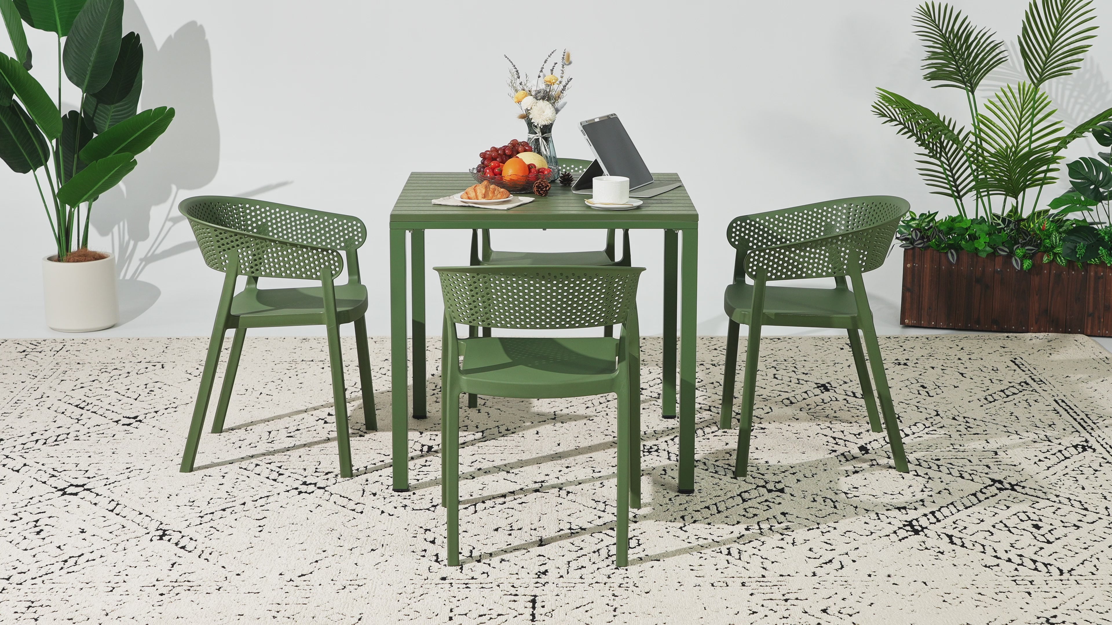 - Set Includes: Four (4) Plastic Resin Dining Side Chairs and One (1) 31.5" Wide Square Patio Dining Table