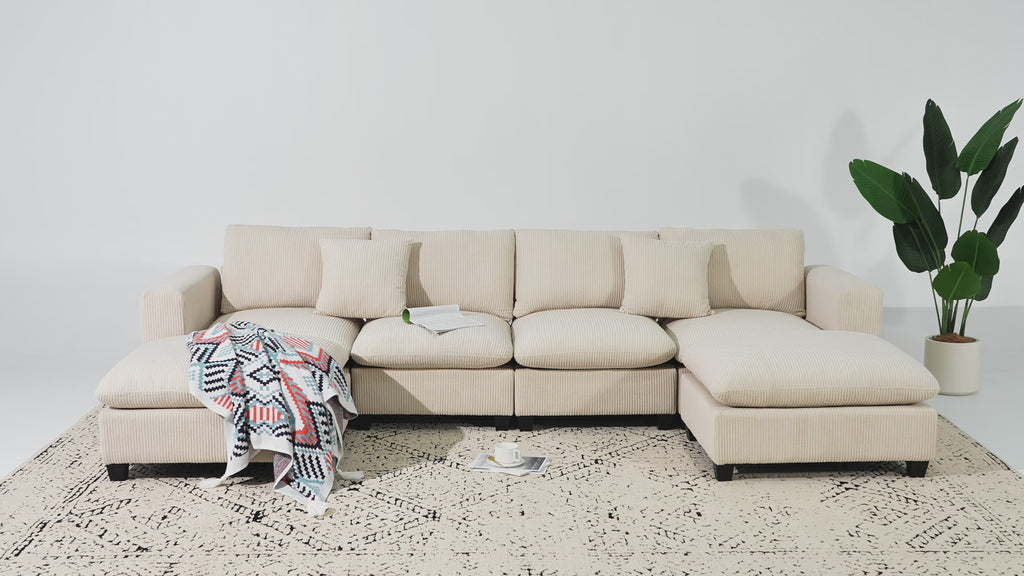 Sink into comfort with our Corduroy u-shaped sectional couch, designed for cozy nights" Perfectly scaled for large sized apartments or family rooms with a generous 113" seat width, featuring a durable plywood frame and supportive S-spring suspension for lasting quality. Plush, extra-wide foam cushions create an inviting and relaxed feel you'll love. Thoughtfully designed with integrated USB & Type-C ports on the right arm, charging devices is seamless and keeps your space clutter-free from bulky chargers and unnecessary long cables. Convenient side pockets offer a discreet spot for remotes and essentials and thick durable legs offer additional stability to ensure perfect floor contact. This modular sectional sofa also includes a 29" x 35" ottoman that can be used to lay on or moved to the side and be used as an additional seat. A welcome addition to any modern home, apartment, or dorm, this corduroy large l shaped couch is your new favorite spot for unwinding with someone special.