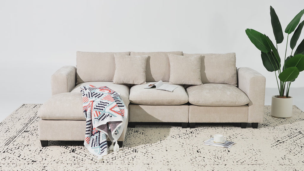 Sink into comfort with our chenille couch, designed for cozy nights" Perfectly scaled for apartments or family rooms with a generous 84" seat width, it features a durable plywood frame and supportive S-spring suspension for lasting quality. Plush, extra-wide foam cushions create an inviting and relaxed feel you'll love. Thoughtfully designed with integrated USB & Type-C ports on the right arm, charging devices is seamless and keeps your space clutter-free from bulky chargers and unnecessary long cables. Convenient side pockets offer a discreet spot for remotes and essentials and thick durable legs offer additional stability to ensure perfect floor contact. This modular couch also includes a 29" x 35" ottoman that can be used to lay on or moved to the side and be used as an additional seat. A welcome addition to any modern home or large sized apartment, this chenille sofa is your new favorite spot for unwinding with someone special.