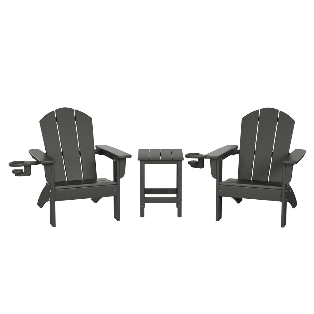 - Set Includes: Two (2) Kids HDPE Plastic Adirondack Chairs with Cup Holders and One (1) Kids HDPE Plastic Square Side Table