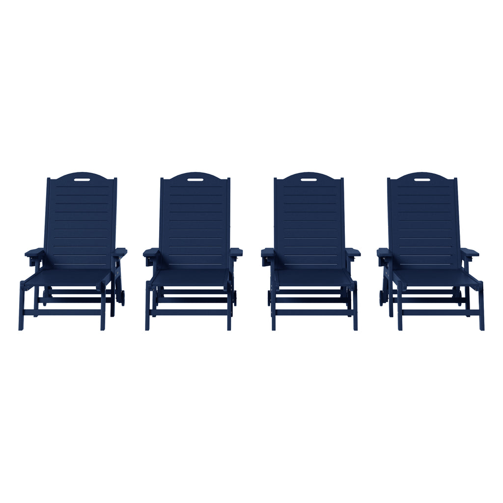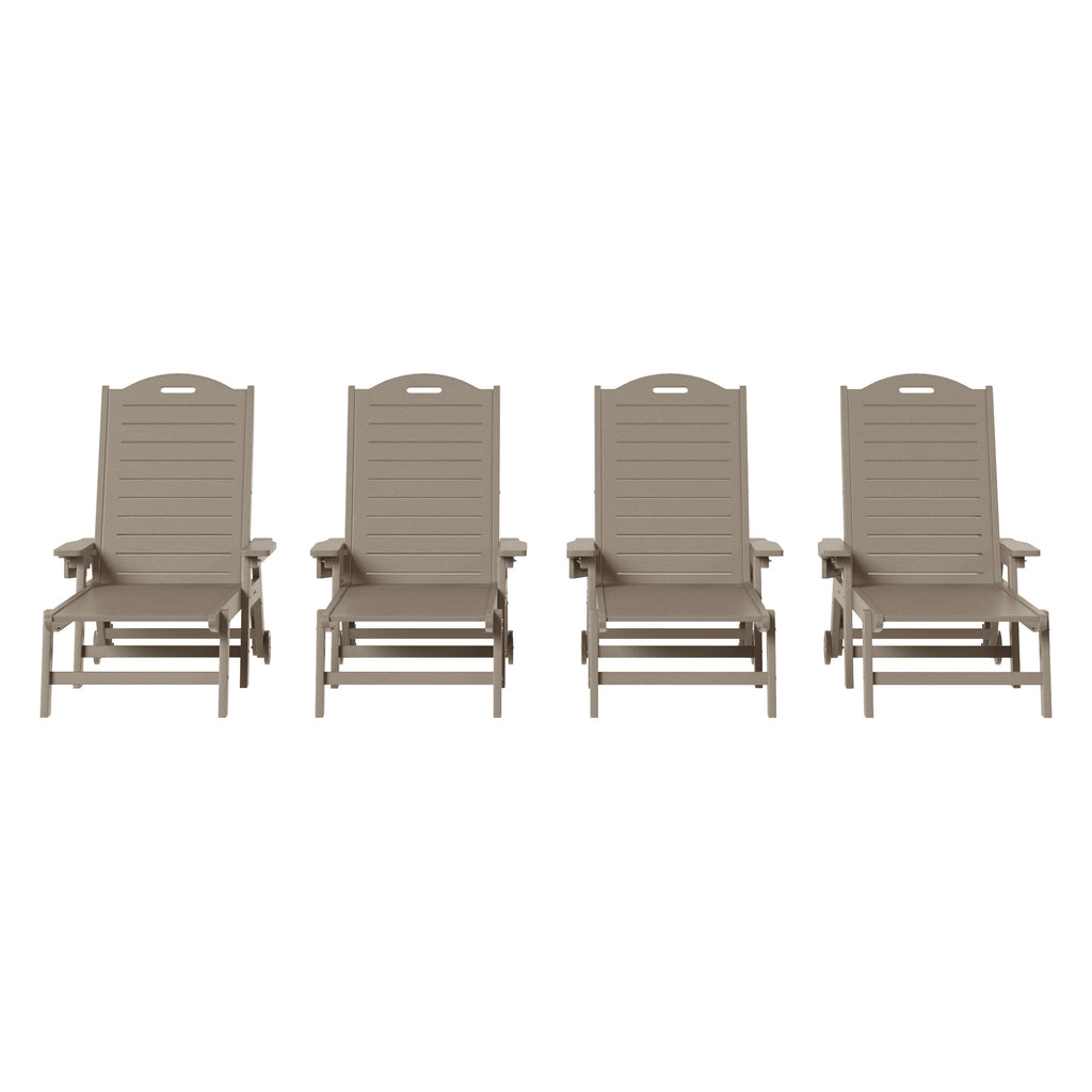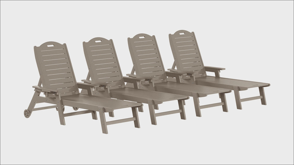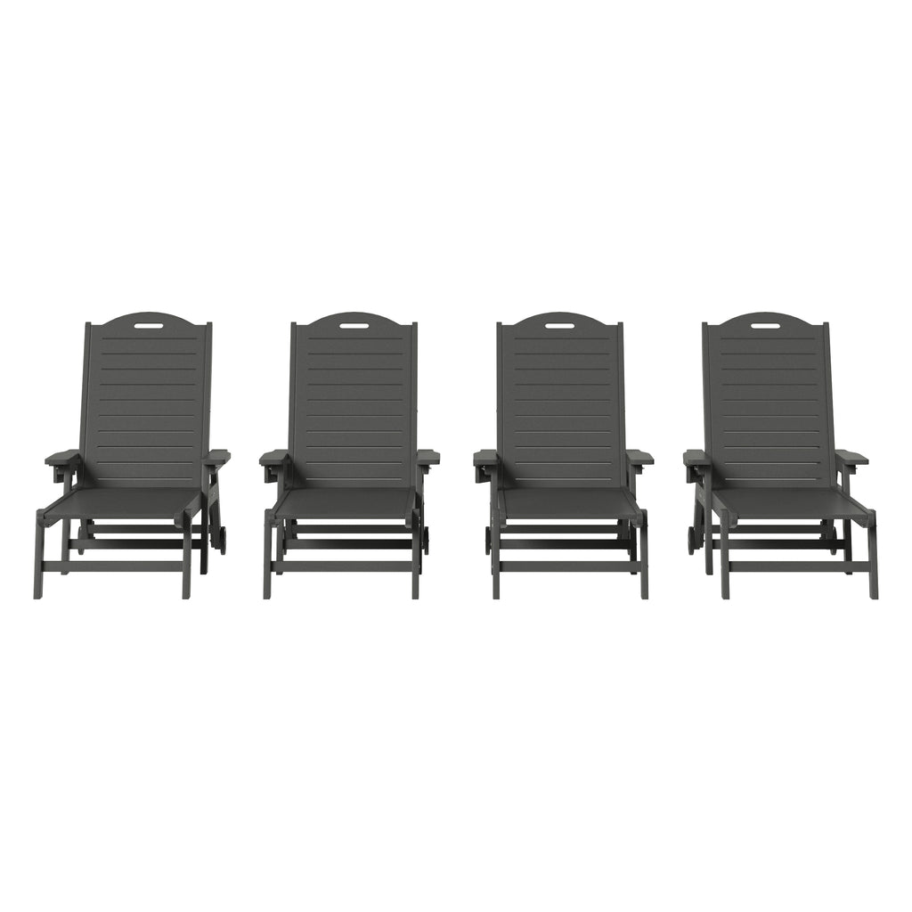 Unwind in effortless style with our Outdoor HDPE Patio Chaise Lounge Set, thoughtfully designed for modern outdoor living. Crafted from premium HDPE, this outdoor chaise lounge set of 4 offers exceptional durability and fade resistance, maintaining their refined color and smooth finish season after season. Each lounger features 5 adjustable backrest positions, including a fully flat setting, allowing you to seamlessly shift from sitting upright with a book to reclining for a sun-soaked afternoon. The integrated 3" cup holders accommodate most tumblers and cups—keeping your favorite drinks within reach—while discreet rear wheels make repositioning the chaise lounge set of 4 simple and seamless. Whether poolside, on the deck, or nestled into your garden retreat, this set of 4 pool lounge chairs combines comfort and resilience. Designed to elevate any outdoor lounge space, these timeless, low-maintenance loungers invite relaxation and perfectly complement any contemporary setting.