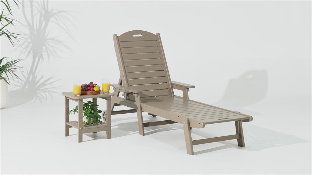 Transform your outdoor retreat with our 2-Piece Outdoor HDPE Patio Chaise Lounge With Wheels & Cup Holder & Matching Patio Side Table. Thoughtfully crafted from durable, weather-resistant HDPE, this set is designed to st& up to sun, rain, & humidity without fading, cracking, or peeling. The chaise lounge features a 5-position adjustable backrest, including a fully flat recline, for personalized comfort whether you’re reading, lounging, or sunbathing. A discreet, retractable 3" cup holder keeps your drink within reach, while smooth rear wheels make repositioning effortless. The coordinating Adirondack side table adds balance & function with its slatted tabletop, sturdy two-tier construction, & reinforced H-frame for enhanced stability. Perfectly suited for poolside relaxation, the patio, or a serene garden corner, this weatherproof, low-maintenance set combines enduring durability with a clean, modern aesthetic that elevates any outdoor space.