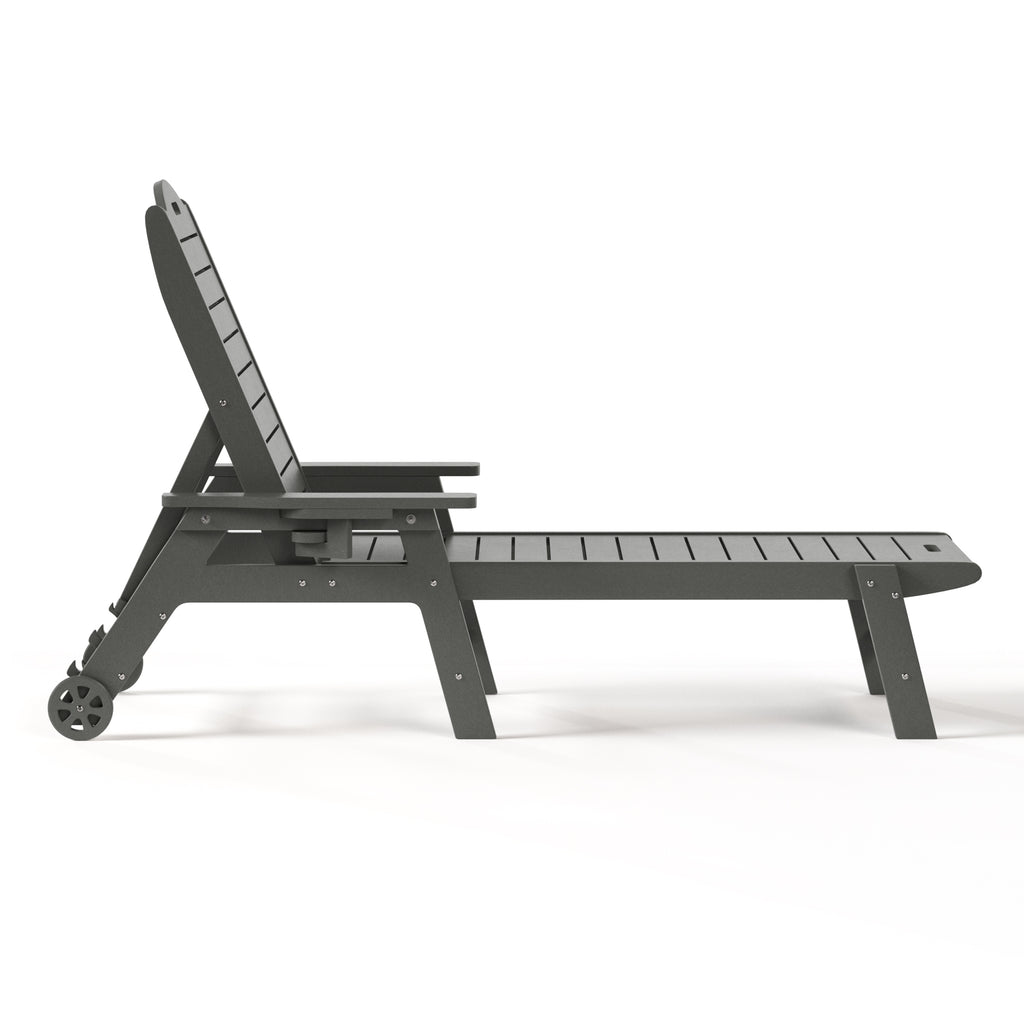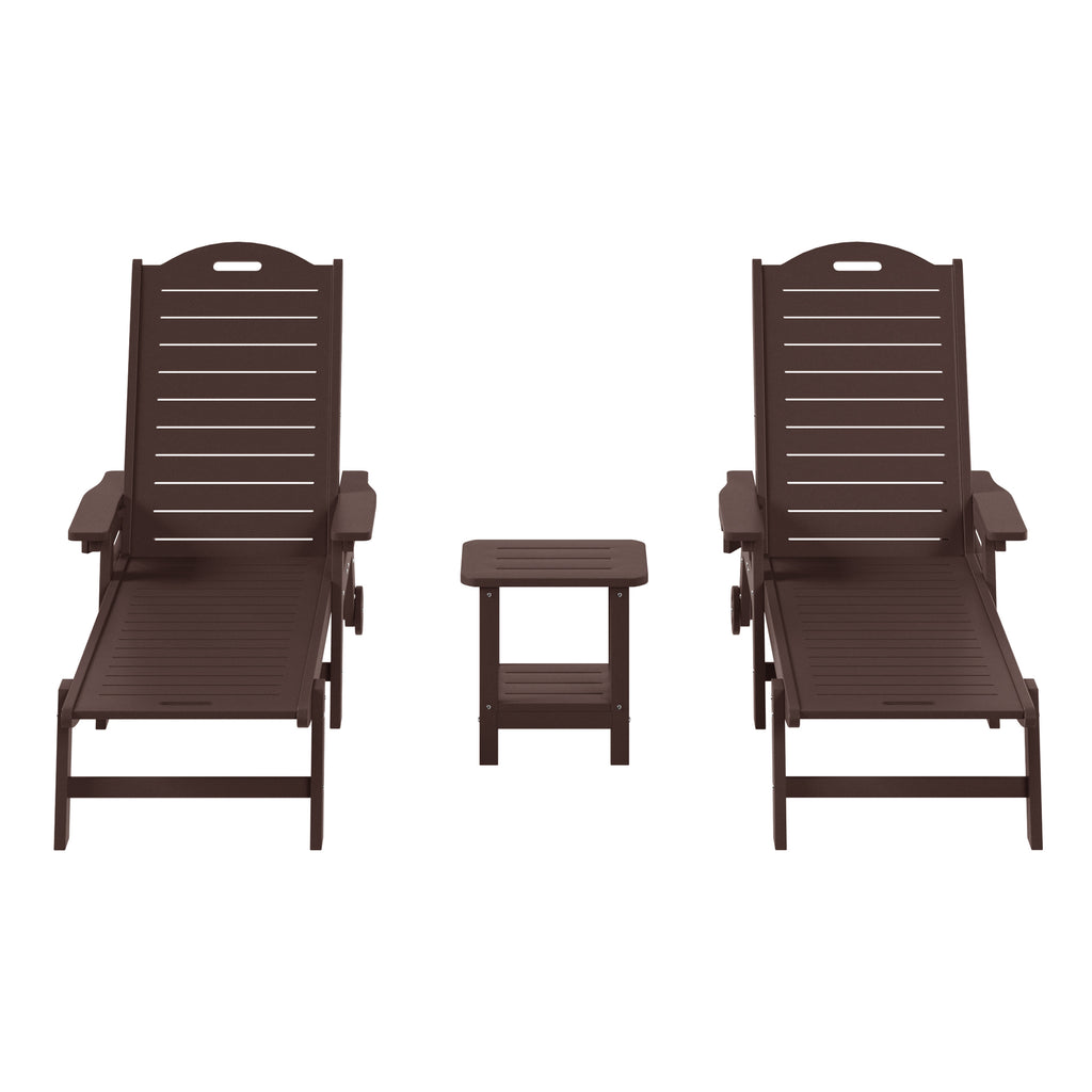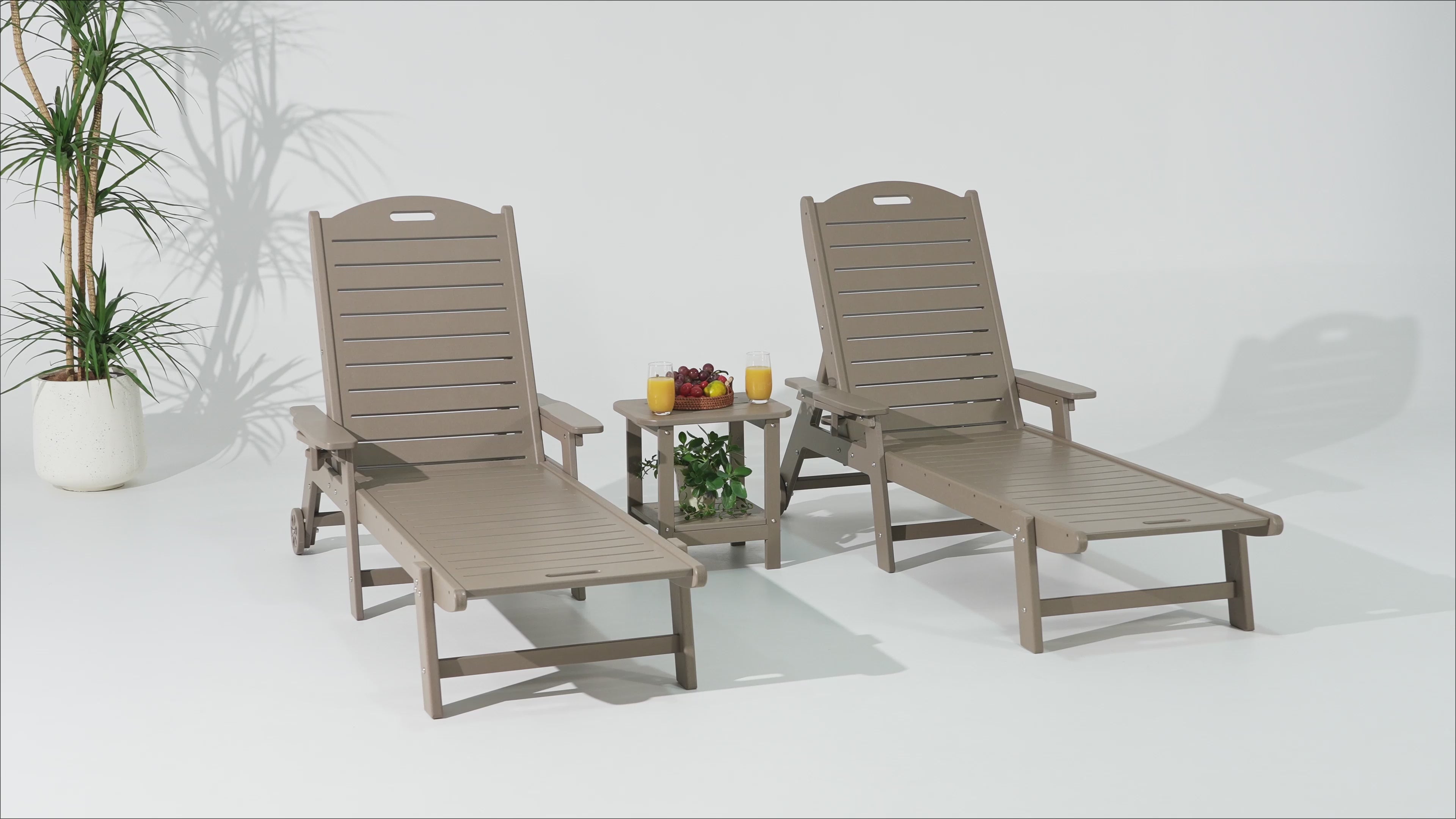 Transform your outdoor retreat with our 3-Piece Outdoor HDPE Patio Chaise Loungers With Wheels & Cup Holder & Matching Patio Side Table. Thoughtfully crafted from durable, weather-resistant HDPE, this set is designed to st& up to sun, rain, & humidity without fading, cracking, or peeling. The pool loungers feature a 5-position adjustable backrest, including a fully flat recline, for personalized comfort whether you’re reading, lounging, or sunbathing. A discreet, retractable 3" cup holder keeps your drink within reach, while smooth rear wheels make repositioning effortless. The coordinating Adirondack side table adds balance & function with its slatted tabletop, sturdy two-tier construction, & reinforced H-frame for enhanced stability. Perfectly suited for poolside relaxation, the patio, or a serene garden corner, this weatherproof, low-maintenance set combines enduring durability with a clean, modern aesthetic that elevates any outdoor space.