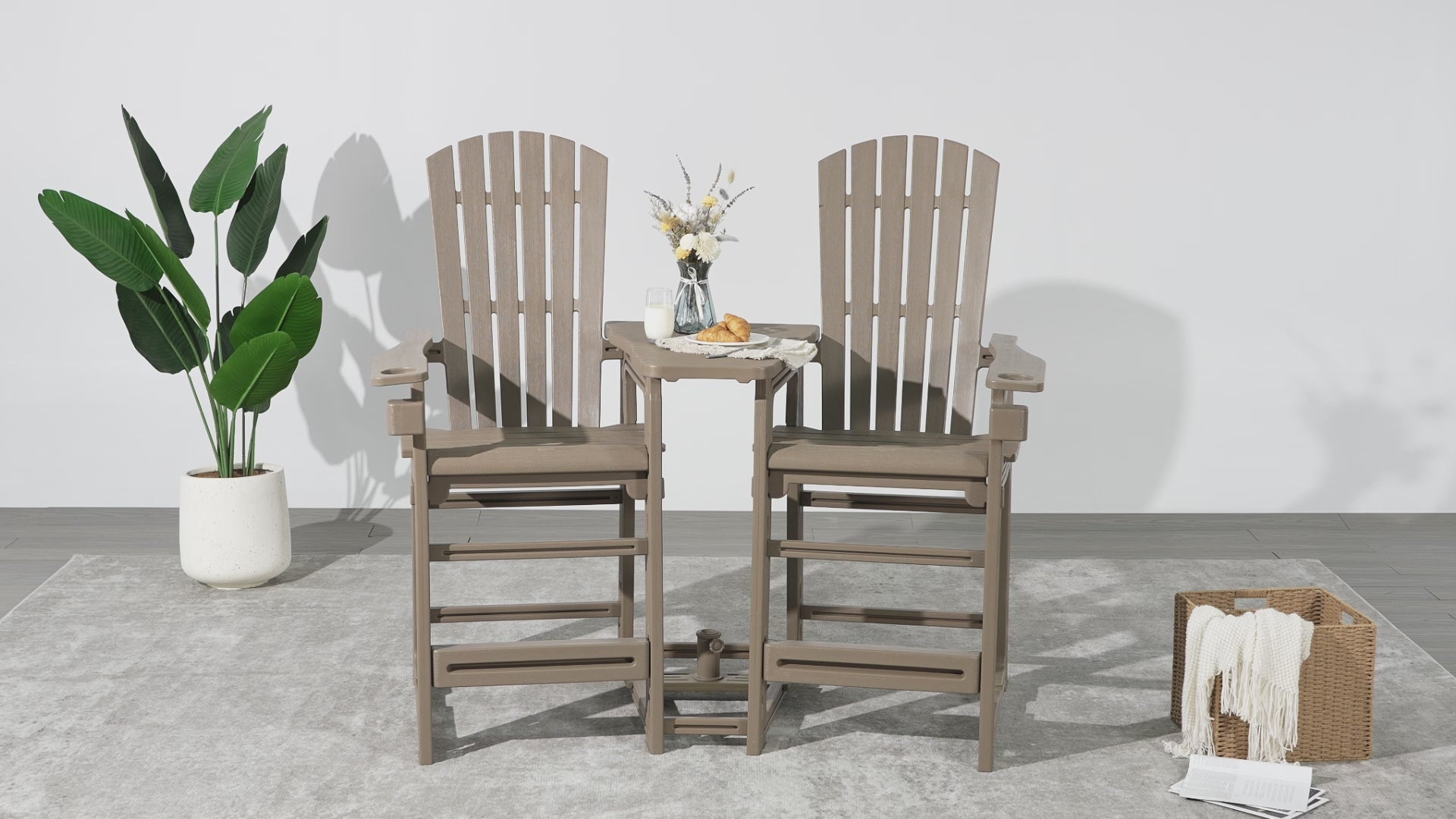 Unwind in style with our premium HDPE Tall Adirondack Bar Chairs, blending aesthetic appeal & profound relaxation. Crafted from durable HDPE, these bar-height chairs boast unparalleled UV & fade resistance for lasting beauty. Say goodbye to tools & frustration: innovative hardware-free, tool-free snap-&-lock assembly ensures swift setup, preventing stripped screws or lost parts, & allowing effortless disassembly/storage. Each HDPE bar-height outdoor chair includes a spacious 3.25" wide cup holder, perfect for most tumblers. A shared, removable connecting tray features an integrated umbrella hole (fits 1.5"-1.9" poles) for optimal shade. Enjoy true outdoor versatility; the detachable tray allows easy reconfiguration to curate your perfect outdoor ambiance. Experience supreme comfort: from the supportive high-back rest & ergonomically contoured seat to the dependable sturdy footrest.