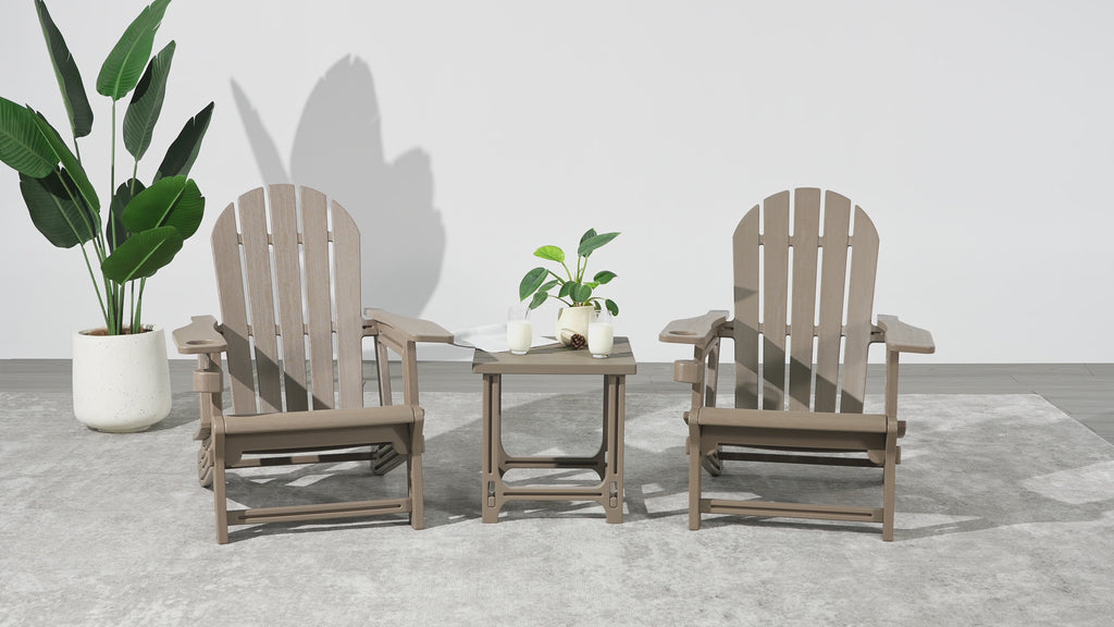 Discover outdoor luxury with our 3-Piece HDPE Adirondack Chairs & Side Table Set, designed for elevated comfort and modern outdoor living. Enjoy easy setup with snap-and-lock assembly—no tools, screws, or missing parts. Made from durable, non-toxic HDPE with a wood-like grain texture, this set resists fading, UV rays, and weather for lasting beauty and safety for kids and pets. The chairs features broad 5" armrests and a discreet 3.25" cup holder for your favorite tumbler and convenient phone holder. Lightweight and easy to move, it’s perfect for any outdoor space. The square side table features rounded edges for safety and a slatted top for quick drainage. Its compact, portable design makes it ideal for decks, patios, or poolside settings. Blending timeless charm with smart design, this set offers style, comfort, and convenience built to last.
