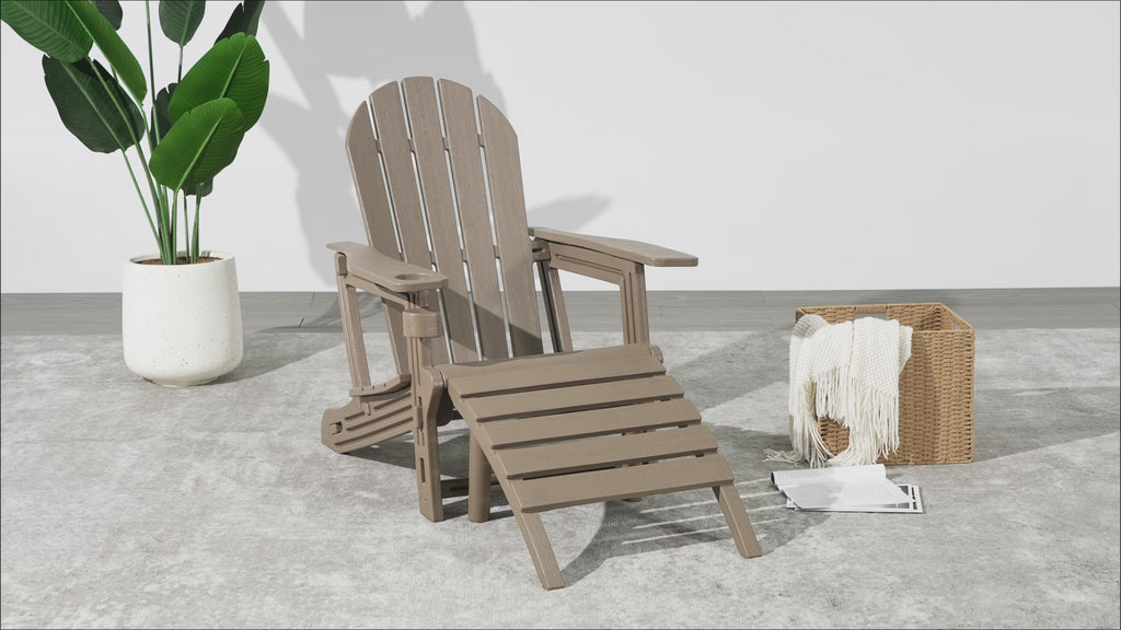 Upgrade your outdoor space with our HDPE Adirondack Chair and Ottoman Set, the perfect blend of comfort, durability, and style. This weather-resistant patio chair features a tool-free snap-and-lock assembly, wide 5" armrests, and a built-in 3.25" cup holder for your favorite drinkware. Paired with a matching curved Adirondack footrest, designed to reduce leg fatigue, this set offers ergonomic support and timeless design. Both pieces are made from fade-resistant, UV-protected HDPE material with a realistic wood-like texture. Lightweight yet sturdy, the chair is easy to reposition and disassemble, while the outdoor ottoman assembles in seconds with screw-in legs. Ideal for any deck, patio, or backyard lounge, this low-maintenance set delivers year-round comfort. This Adirondack Chair with Cup Holder and Patio Ottoman is the perfect set for your backyard.
